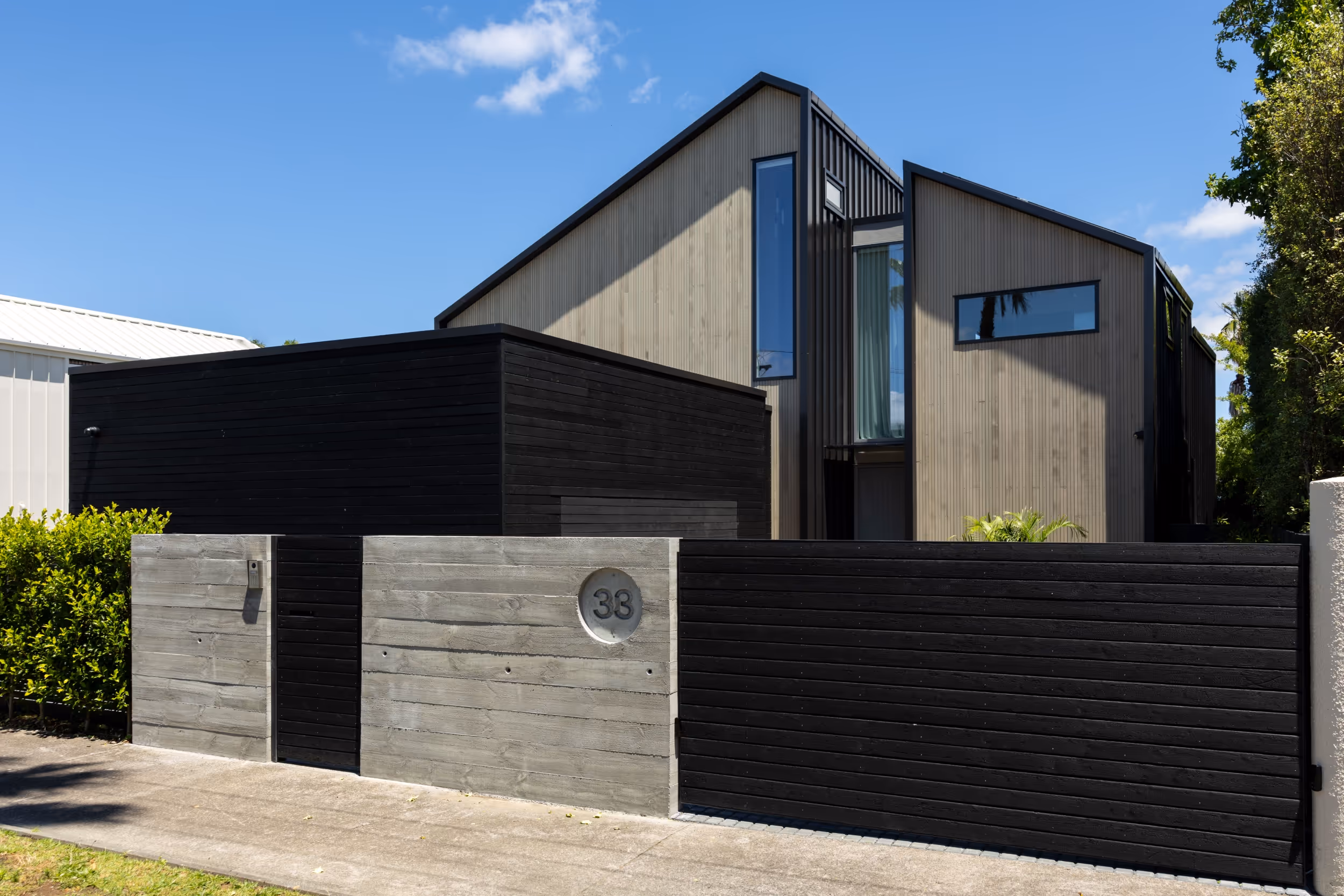 Built with a powder-coated aluminium frame and burnt cedar cladding, this gate was designed to mirror the home’s façade while keeping the material weight light. Builders JD Construction Co prepared the walls; we delivered the gates and a recessed maglock. Cast-in-situ concrete walls have neat edges with side-mounted posts and custom tapered flashings to close gaps and create a seamless line. We devised a customised letterbox slot cut into the pedestrian gate to keep the frontage tidy. Architect: Stacey Farrell.