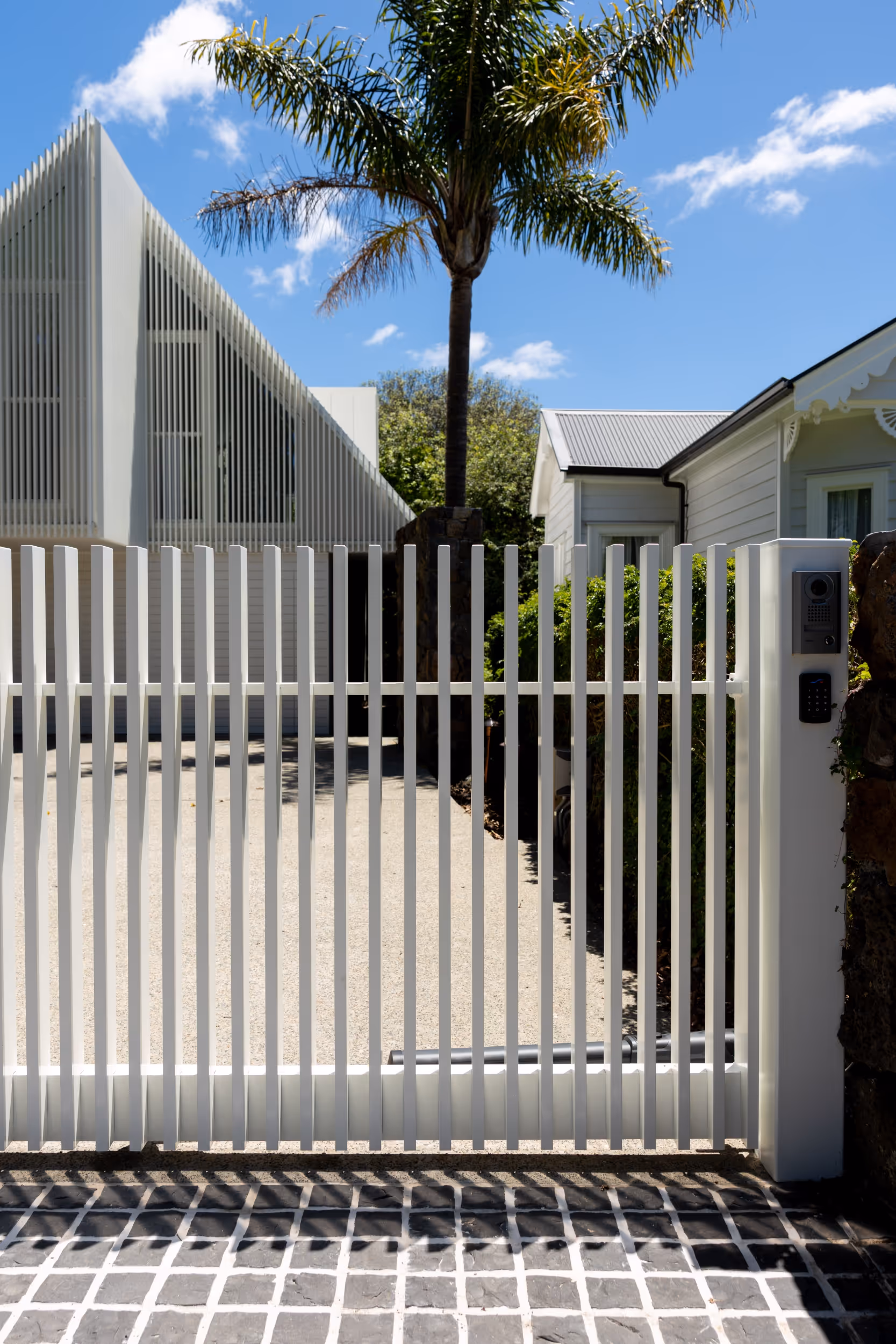 Working from the architect’s garage/sleepout design, we engineered a cantilevered swing gate with a larger base plate to keep the motor visually quiet. A powder-coated matte white finish on 150 steel edge posts gives a crisp, clean expression integrated with the basalt walls. Each vertical features a welded top cap for aesthetics and longevity, with a matte finish that provides a timber-like appearance. Architect: Studio2 Architects. Builder: JD Construction Co.