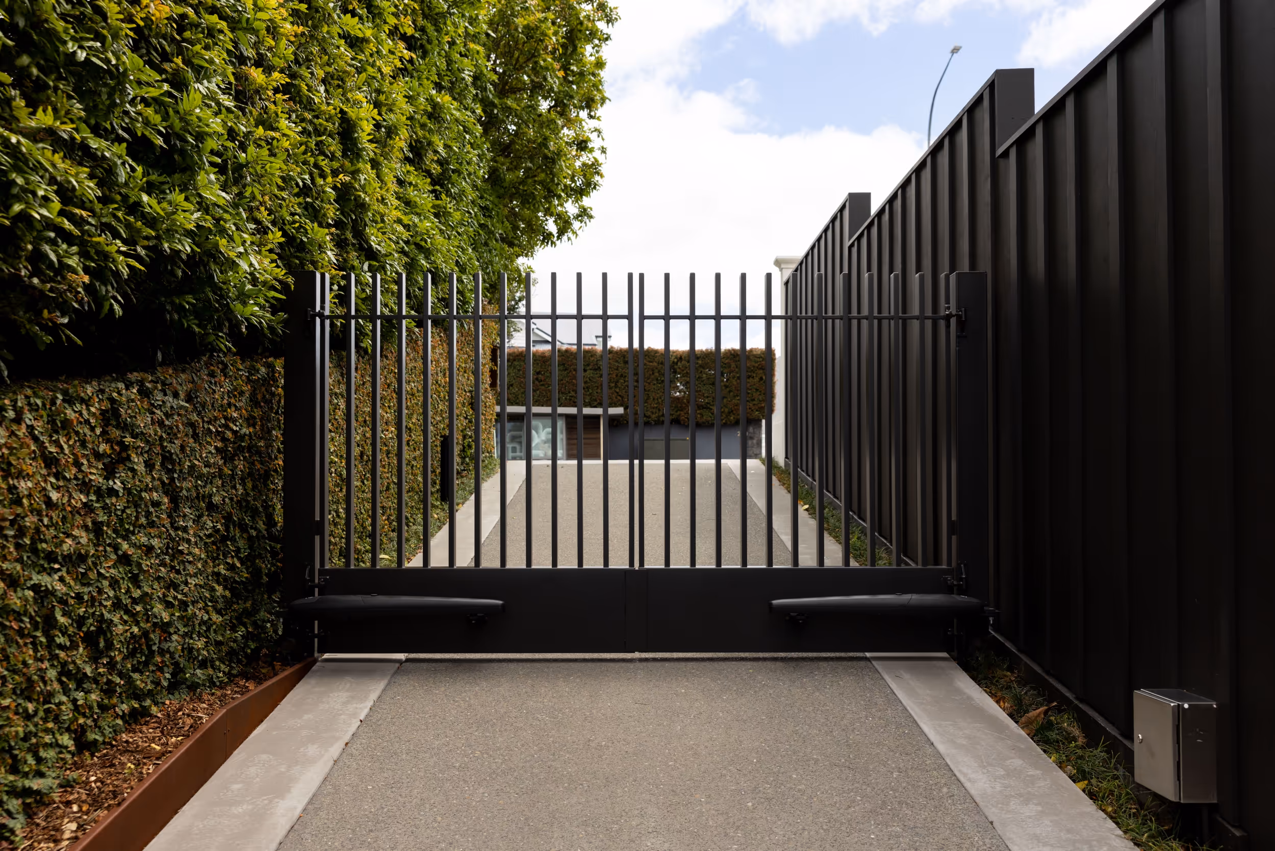 Vertical fins set the rhythm on this double-swing driveway gate, where a tall base carries through, disguising the motors behind. We hand-painted the motor casings to match the gate colour and avoided a ground stop by welding a plate to one of the leaves for a neat closure. The gate is supported by two powder-coated steel posts and installed along the drive to allow vehicles to clear the road and footpath before opening. Landscape: SGLA.