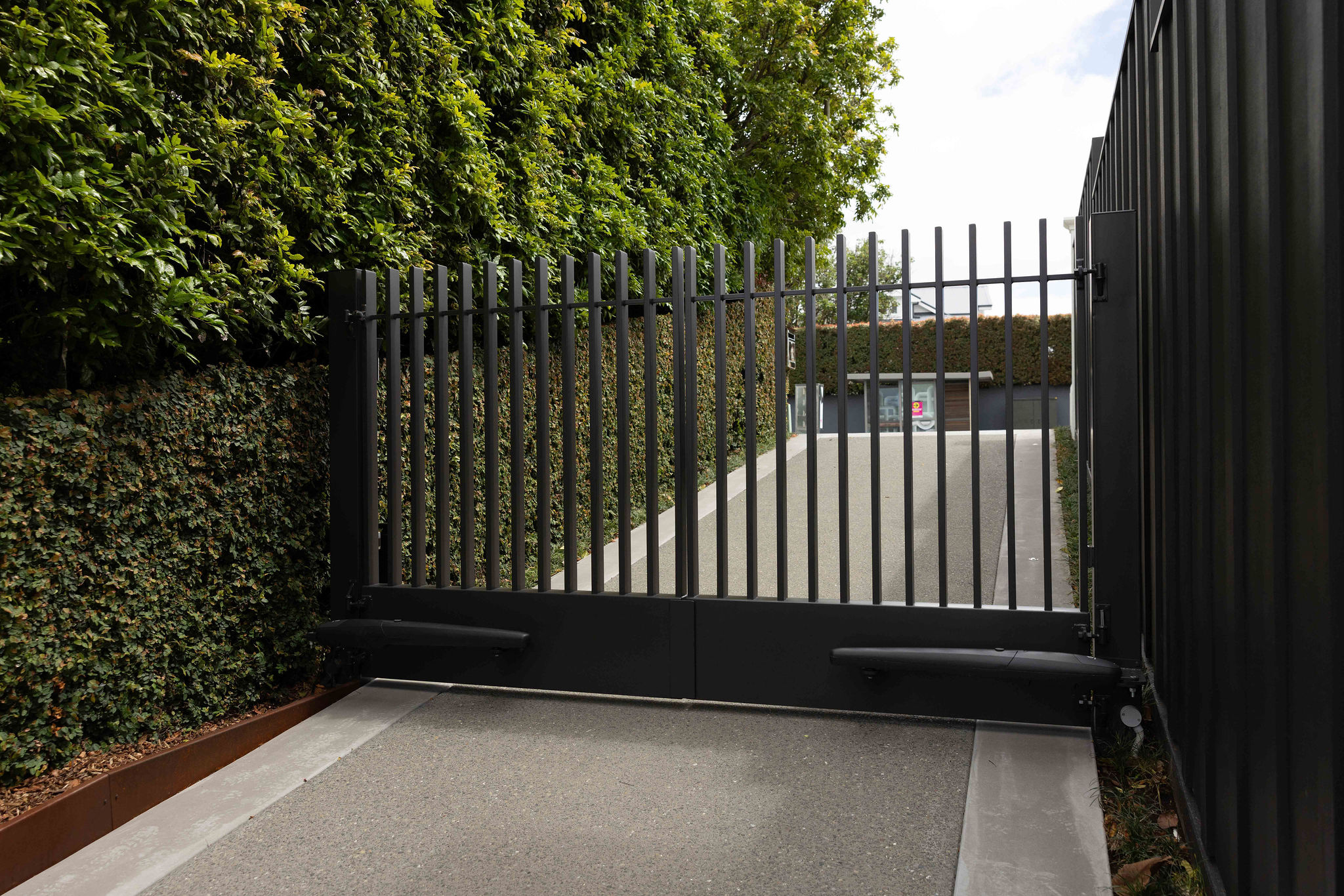 Sliding openers are by far the most common automation system for custom gates Auckland wide — and for good reason. A sliding gate runs along a track, using a motor with a rack and pinion system to open and close smoothly.